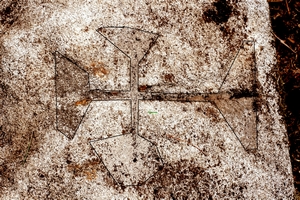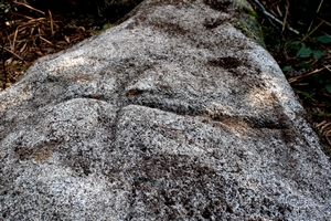 Après quelques jours de recherches le fameux bloc de granite était retrouvé, recouvert d'humus, de feuilles de fougères et d'arbrisseaux. Un petit groupe d'amis d'Ora fontium et la famille Gabolde, ont dégagé ce superbe bloc de granite qui effectivement porte une belle croix pattée, sans doute une croix de Malte simplifiée.