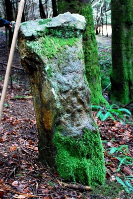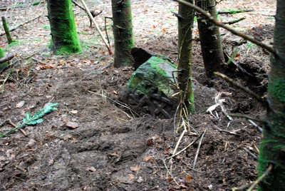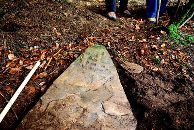 Tout dabord, la découverte du bornage limitant la partie nord du domaine des Dames de Prouilhe avec les Chartreux d'Escoussens (forêt du Cayroulet). Après un travail préparé avant l'excursion : étude du tracé, et pré-positionnement des bornes sur la tablette, nous avons été très surpris de la qualité du guidage de notre GPS et logiciel ... et plus ou moins de chance, comme le dit François !, 3 grandes bornes doublement gravées d'un côté des armoiries de Prouilhe, de l'autre de celles des Chartreux , ont été retrouvées, une plantée « bien droite », deux autres renversées et partiellement enterrées. Nous connaissions l'existence de ces bornes qui étaient décrites dans une vérification des limites de Ramondens réalisée en 1609 (voir notre mémoire sur Arfons et Ramondens : il reste encore quelques exemplaires !!), mais il y était déjà dit que plusieurs d'entre-elles étaient au sol et que d'autres étaient en très mauvais état, ce qui explique sans doute que 3 autres bornes de la même série n'ont pas été aperçues lors des travaux forestiers et sans doute ensevelies.