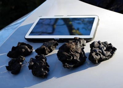 « en faisant le tour de la fontaine du Trou Obscur, j'ai trouvé de très nombreux résidus de fonte de fer, au bord de l'eau à 10 ou 20 mètres de la source. J'en ai ramassé pour Ora Fontium (voir photo ci-dessous). Ne serait-ce pas là le premier site découvert d'une production de fer très ancienne bien connue par les archives en forêt de Ramondens ?"